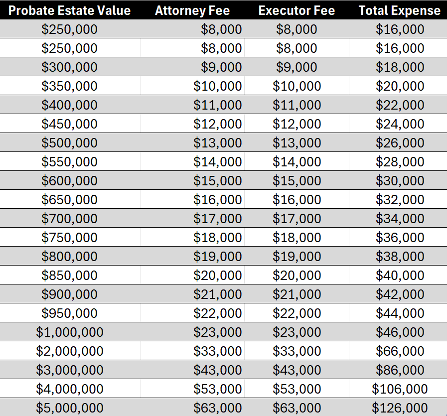 The table below estimates potential statutory fees for both the attorney and the executor or administrator, based on the value of the probate estate.